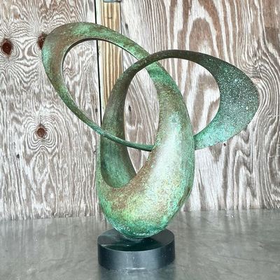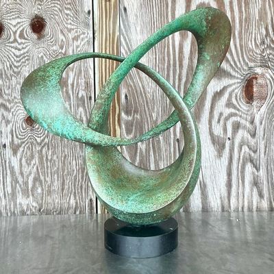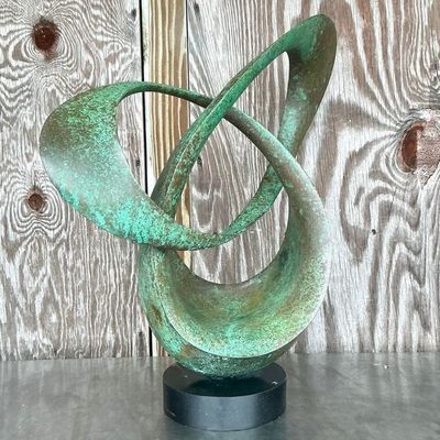 Abbraccia la bellezza senza tempo dell'arte invecchiata. Questa squisita piccola scultura è realizzata in rame massiccio e rifinita con una straordinaria patina verdigris dall'aspetto naturale. Questa distintiva tonalità blu-verde, che ricorda statue antiche e dettagli architettonici usurati, non è semplicemente un rivestimento, ma una celebrazione del nobile processo di invecchiamento del metallo.