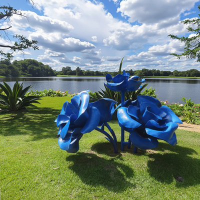 Queste grandi sculture di rose di fiori blu dipinte sono una splendida miscela di arte e natura.La tonalità blu brillante porta un tocco di fantasia e vivacità, trasformando il giardino in un paradiso artistico dove le persone possono apprezzare la bellezza dell'arte e dell'ambiente naturale..