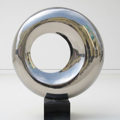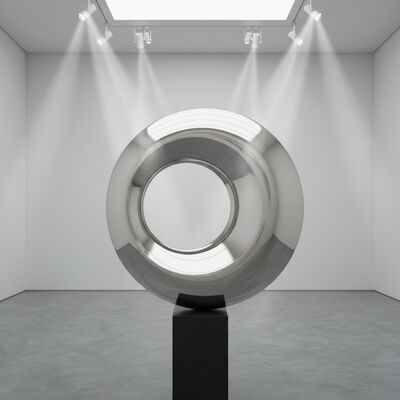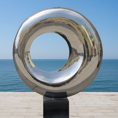 Questo pezzo di arte moderna in acciaio inossidabile presenta una superficie a specchio lucida che cattura la luce e l'ambiente circostante, trasformando la forma circolare astratta in un punto focale dinamico per qualsiasi spazio moderno.