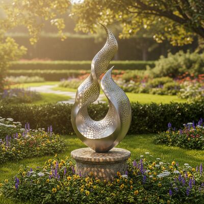 Inspired by the dynamic motion of flames, this large-scale perforated metal sculpture captures movement in stillness. Crafted from premium stainless steel with precision laser-cut patterns, it transforms ambient light into a mesmerizing glow — especially when internally lit. Its organic curves and hollow structure create depth and shadow play, making it a focal point in any modern space. Ideal for luxury homes, hotel lobbies, public square, or garden, this piece blends contemporary artistry with architectural elegance. T
